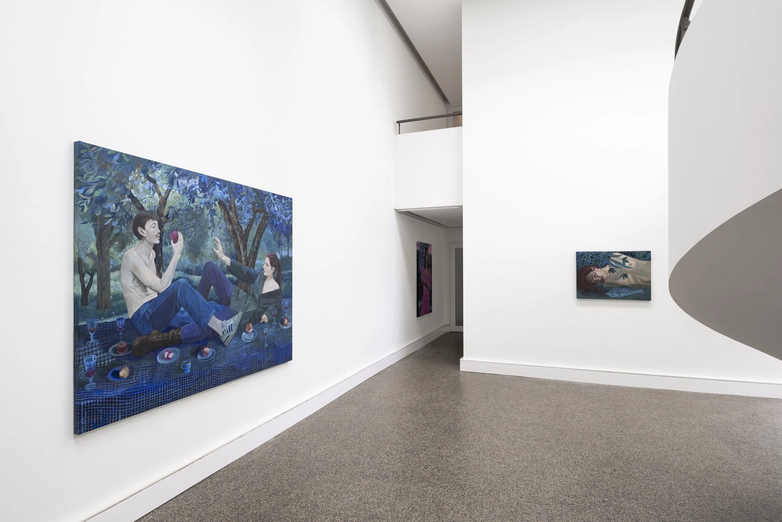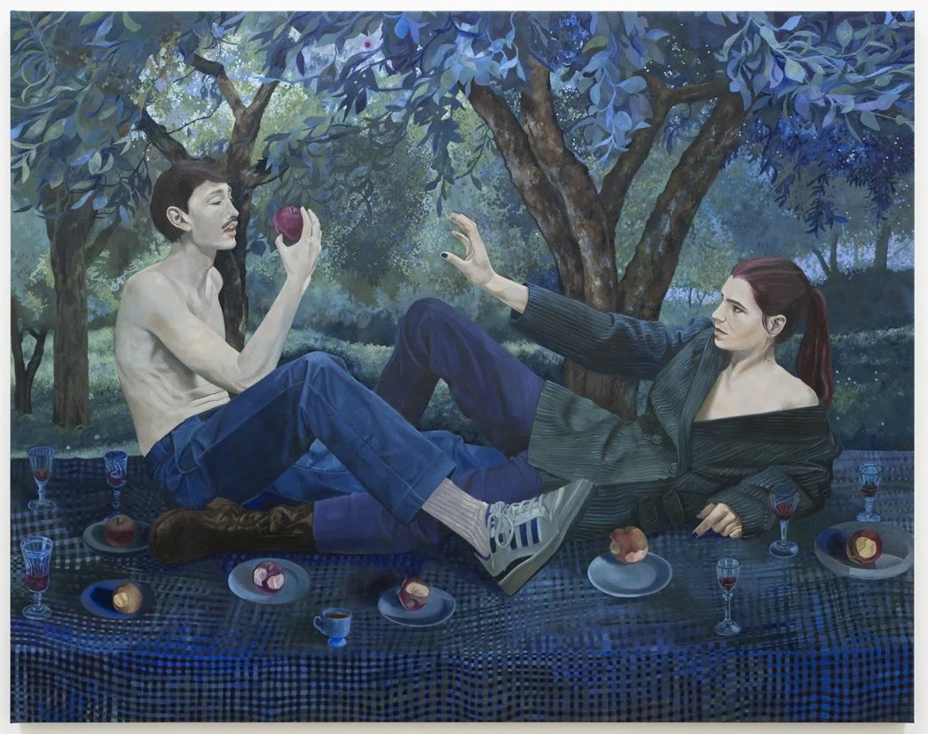 In her monumental work, Debutants, the artist sits on a blanket in a park with her male model. Unlike Édouard Manet’s Le Déjeuner sur l’herbe (1863), the model is male, half-dressed but not nude, like Manet’s female model. Through this reversal of gender roles, Burn counters the traditional “muse” trope that has long permeated Western art. Like Manet’s painting, which drew on art-historical precedents such as Titian and Raimondi, Burn’s work also grapples with the weight of tradition, depicting a transformative scene. Rather than objectifying the male figure, she positions him as an equal participant in the scene. Although Burn is rooted in tradition, her aesthetic vocabulary and her contemporary sensibilities transport the images into the present day.