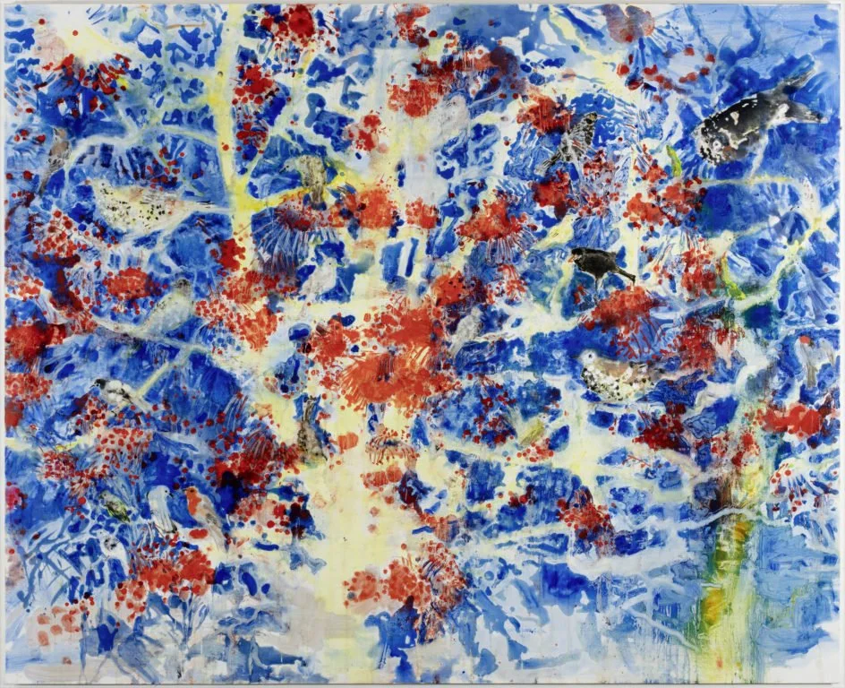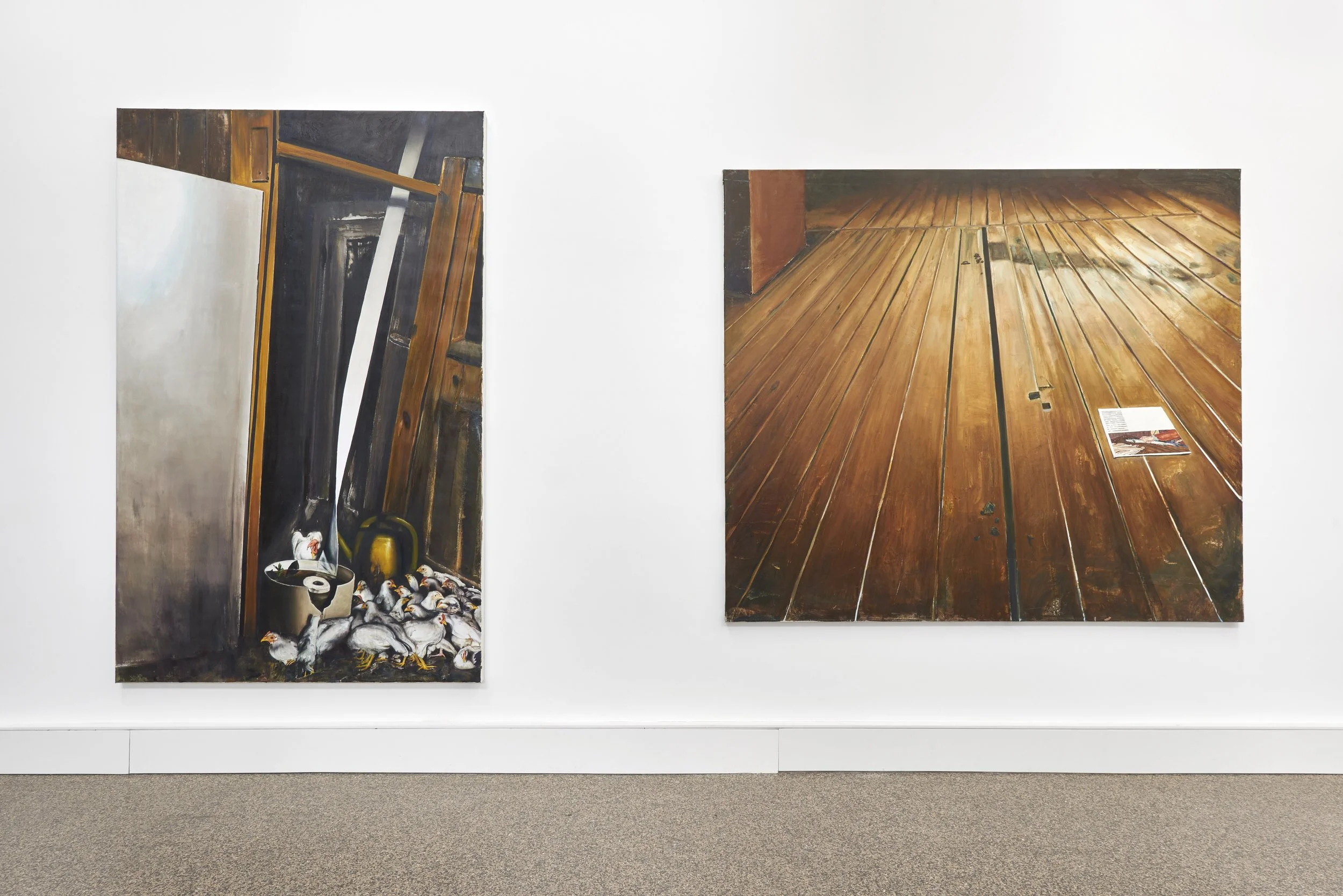 Two large paintings by Léopold Rabus, Pêche en Haute Savoie (2017) and Poules avec guirlande (2022) teeter on the boundaries of fantasy and reality. One, featuring a nearly empty room, shows wooden floorboards, with light coming from above and a perspective that seems both impossible and disorienting. Rabus's large-scale painting of chickens, these flightless birds, echoes this need to escape but being unable to. Trapped as domesticated and farmed animals, their future already pre-determined.