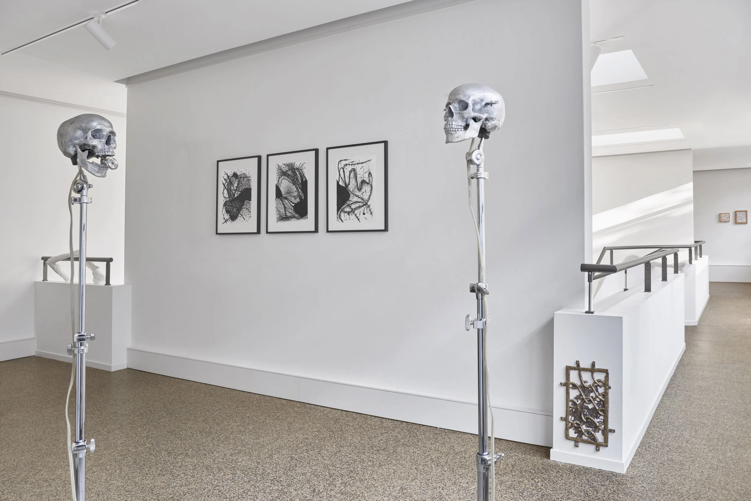 Entering the gallery, one encounters Jan Fabre's Devil Mask (2002). The gold-coated sculpture is shaped like a human sacrum, which in Prehispanic Mesoamerica was considered the "sacred bone," representing a portal or doorway permitting the translocation of shamans, spirits, and deities between worlds or dimensions of the cosmos. The work echoes the tradition of these communities using animal pelvises to form ceremonial masks. This need to escape our realities is perhaps unique to our species and was documented by Yann Gross and Arguiñe Escandón during their travels to the Peruvian Amazon. There they photographed shamans performing indigenous Ayahuasca rituals. The other image depicts a young woman holding a native Aloe Vera over her face as a mask. In the work of Antoine Roegiers, a film adapted from the painting Squelette arrêtant masques (1891) by James Ensor, a partially-masked skeleton in a red coat stands behind a masked woman, as she dances with another skeleton, giving the macabre subjects an air of festivity.
