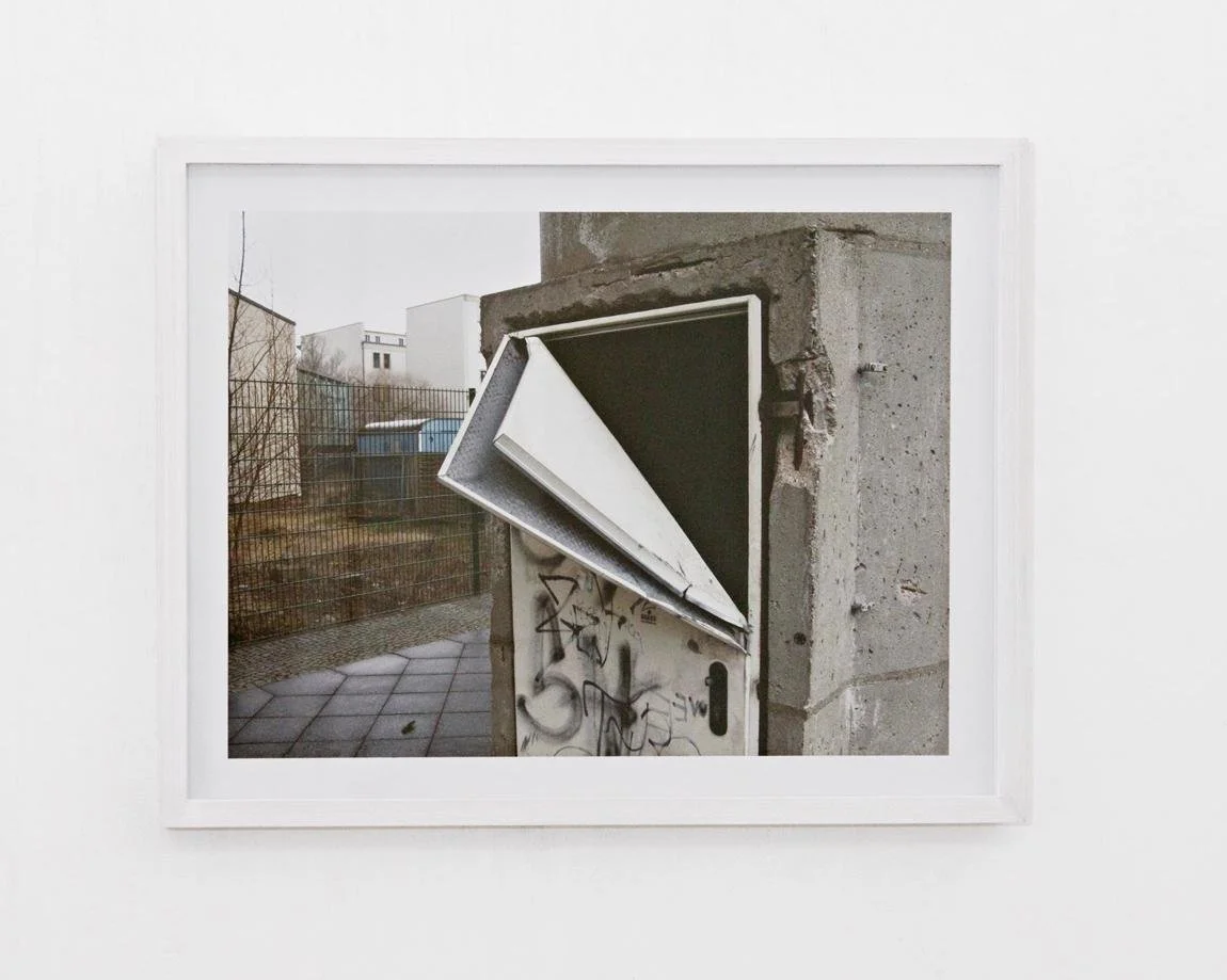 This notion of escaping from our domestic realities is particularly compelling in the work of Lou Masduraud, which comprises four air vents located in different rooms around the gallery, serving as psychological and physical portals. One such work, a black-and-red-glazed ceramic sculpture, appears to have been pried open as if someone were trying to enter or exit. Adjacent to it, a work of Per Barclay features a frame with a protruding steel staircase, evoking a passage. And on the opposite wall, Open Door (Berlin) (2011) by Florian Graf depicts just this.