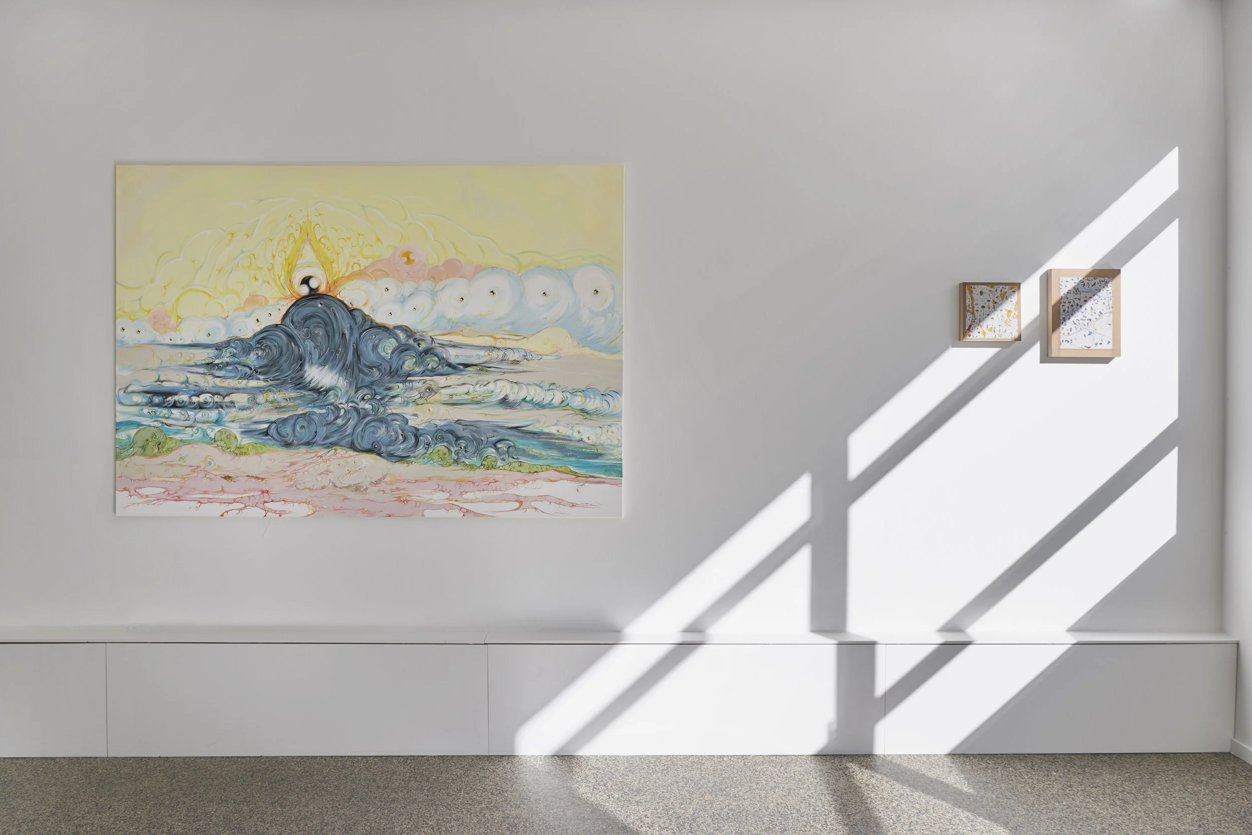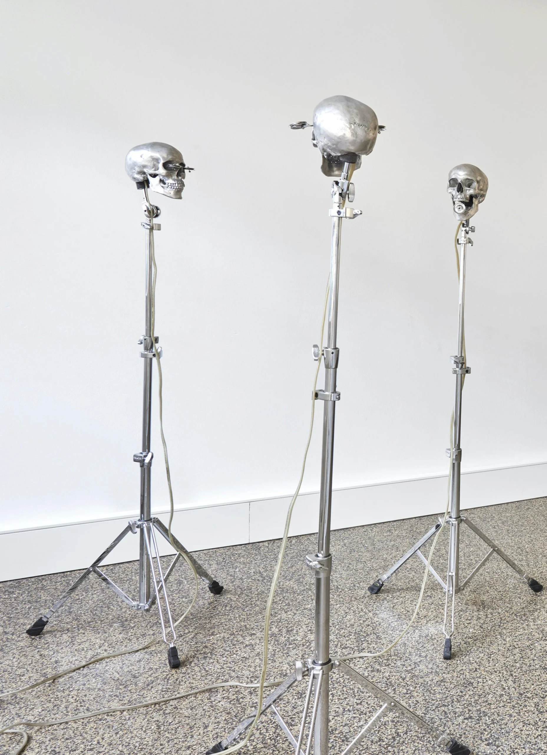 Per Barclay challenges such a need for escapism. In his work, Conversations (1997–2006), three aluminum skulls face each other, with pairs of metal zils placed where their eyes, ears, and mouth would be. They symbolize the three wise monkeys, who "see no evil, hear no evil, speak no evil," which is how we collectively behave in Barclay's opinion, ignoring the degradation of the climate and inequality of wealth. Similarly, Valentin Carron's work, Ovals in the Dark XII (2022), depicts two masked faces floating in an empty abyss, unable to communicate. As Mounir Fatmi's work, Everything is Connected (2018), illustrates, such a desire is futile. Our lives are intertwined, to each other, to our environment, and to the technologies we invent. Vidya Gastaldon's work is engrained in this idea. For her, cosmic representations give the appearance of a larger, complex ecosystem. She considers herself a vessel, painting wonderous worlds in which nature would have a magical force.