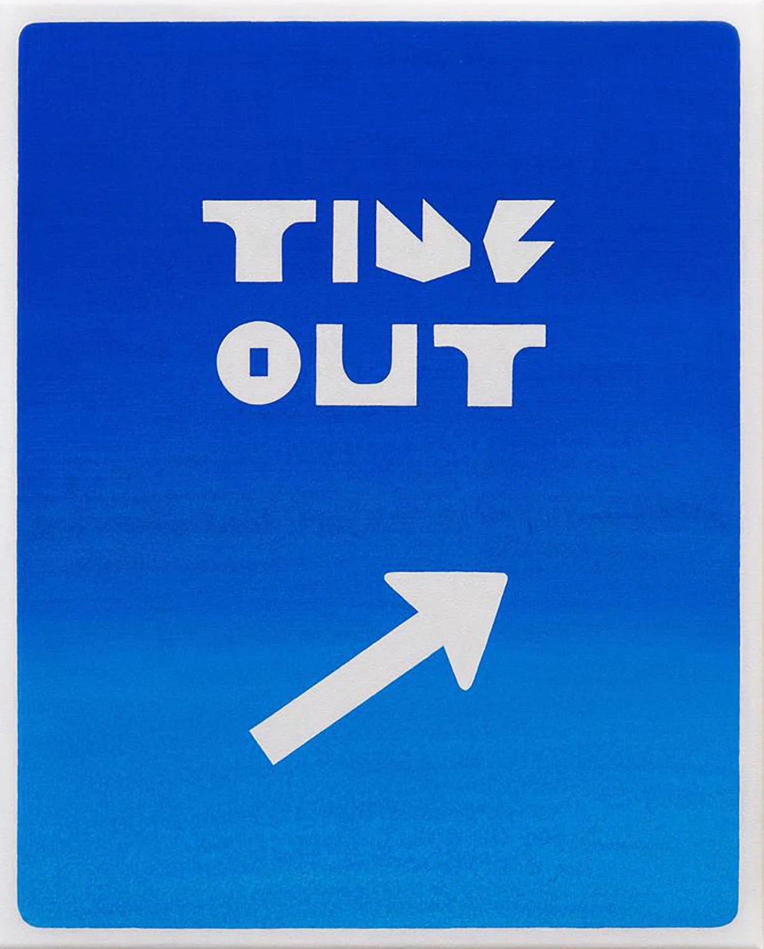 In contrast, the third room on the ground floor features some hope to actually escape, to take a Time Out, as is written on the painting by Florian Graf reminiscent of Ruscha-esc sign-painting or billboard, advertising some solution to feeling mentally entangled. Two portraits, one by Patricia Kaliczka with a bird on her head, pecks at her third eye, threatening her enlightenment perhaps, while the second by Fabien Mérelle portrays him perilously atop a tree. Do they long for the freedom birds symbolize? The painting Arboretum 2 (2021), by Rachel Lumsden recalls a lush garden teeming with birds. A coming of spring, of winter, finally giving way. Finally, the watering can, Lucky Loop (2021), by Florian Graf waters itself, conceivably a form of self-care, of tending to a garden which in return tends to the well-being of its caretaker.